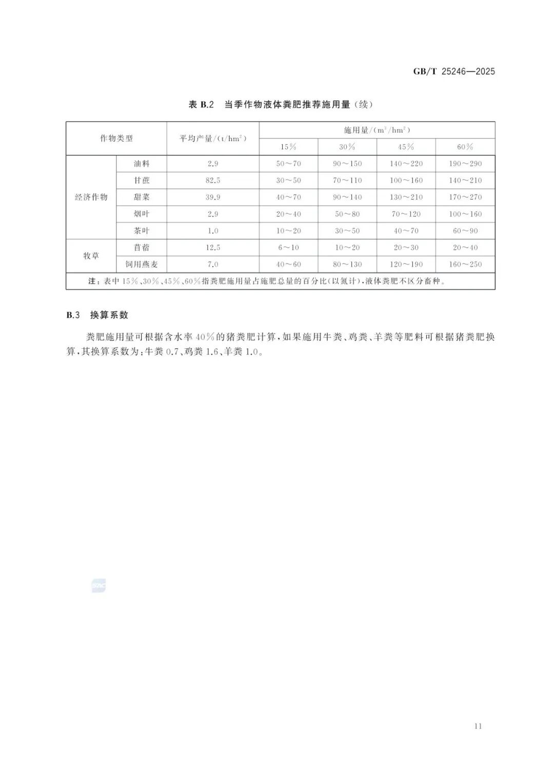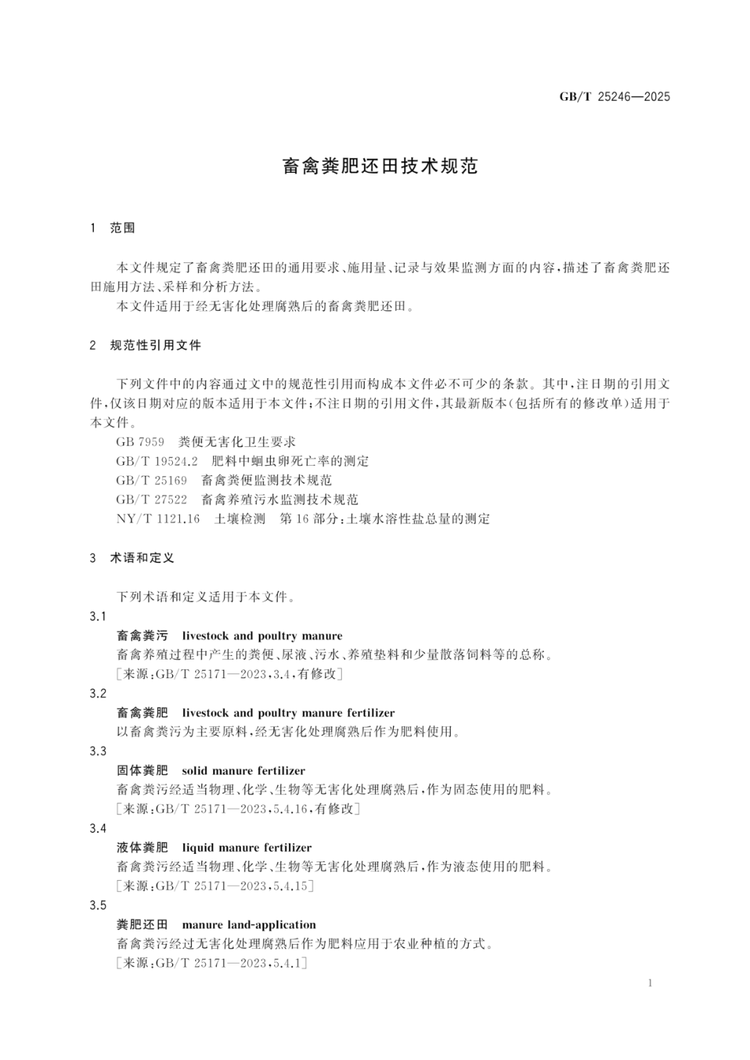 2025年1月24日,国家市场监督管理总局(国家标准化管理委员会)正式发布了《畜禽粪肥还田技术规范》(GB/T 25246─2025),该标准已经于2025年8月1日起正式实施。它的出台,为畜禽粪肥还田提供了明确、科学的指导,将有力推动我国农业绿色发展迈向新高度。接下来,就让我们一同深入了解和学习这项新标准的原文内容吧!