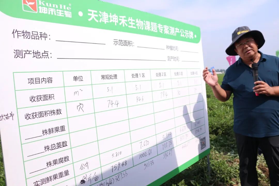 测产数据显示:与常规管理(亩产387.33公斤)相比,施用不同配比“坤禾健地”的试验田块均表现出显著增产效果。其中,处理1(亩施37.5kg复合肥+12.5kg坤禾健地)的实收亩产高达511.33公斤,增产幅度达32.01%,效果最为显著。处理3(亩施45.0kg复合肥+5.0kg坤禾健地)和处理4(亩施42.5kg复合肥+7.5kg坤禾健地)也分别取得了14.80%和12.56%的稳定增产。这一组扎实的数据,直观地展现了该产品在提升花生产量方面的巨大潜力,赢得了现场嘉宾的一致赞叹。