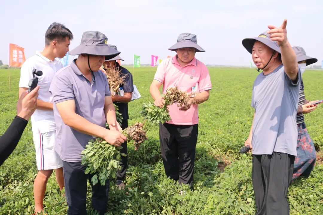 示范田种植户汪洪才向大家介绍了示范田具体种植情况。在种植初期,由于种植深度问题,他的花生田比其他种植户出苗晚许多;生长到中期时,当地遇到干旱,常规施肥的花生田出现打蔫情况,示范田花生植株依然水灵挺立;到了种植晚期,周边对照田花生植株发黄,出现早衰现象,示范田一片郁郁葱葱。汪大哥表示,“坤禾健地”的效果就是牛,今年花生的增产显而易见。