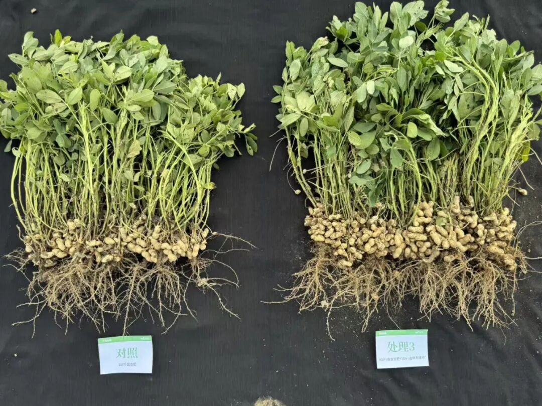 ▲示范田花生(处理3)与对照田花生对比