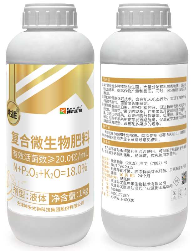 坤益胜复合微生物肥料优选多种植物益生菌,有效活菌数≥20.0亿/mL,N+P2O5+K2O=18.0%。产品中富含枯草芽孢杆菌、胶冻样类芽孢杆菌、贝莱斯芽孢杆菌,可大量分泌有机酸类物质,促进作物光合速率,提高作物产量和品质,同时,可分解拮抗常见病原真菌。产品采用CMP细胞休眠技术,含有机无机态养分,实现了液体产品不腐败不胀气、菌活性长期稳定。在新梢萌发前后施用,生根壮梢控旺、促进新梢老熟和花芽分化发育,预防花少果少的现象;在瓜果菜开花前和落花后施用,促进壮花稳果、幼果细胞分裂增殖、拉果、果形正、防裂果;在秋冬季果树花芽发育期施用,促进花芽发育饱满和雄雌蕊发育成熟,改善花多果少的现象。